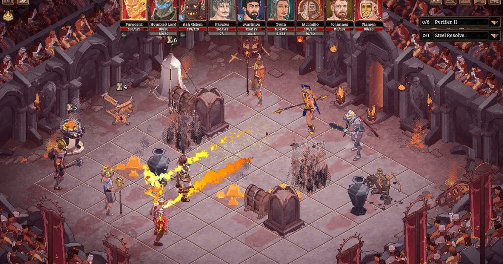 Gladiators need to win the crowd, and Bloodgrounds is very much playing the hits (5% critical chance). Its tussles take place in handsomely decked pixelart stadiums boasting such ornamental fixtures as flaming torches and crucified bodies. Your characters and enemies move around according to an initiative bar along the top. There’s a no-nonsense distinction between movement points and action points, which are used to perform regular attacks and special abilities, while consumables can be played for free.