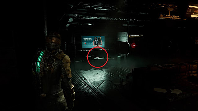 The USG Ishimura. Leave the Kellion, and follow Hammond, Chen, and Daniels down the walkway. Open the locked door to the Flight Lounge. Go inside, turn left, and pick up the log from the table underneath the Welcome Aboard sign.