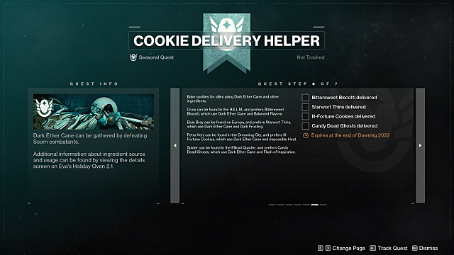 Cookie Delivery Helper is the second and longer questline during The Dawning 2022 event in Destiny 2. Completing it will allow you to unlock every recipe for use in Eva’s Holiday Oven 2.1, and each quest step guides you to where you can get the ingredients and who each treat you bake goes to. We’ll go over each of the seven steps to Cookie Delivery Helper in this guide, so there are no surprises.