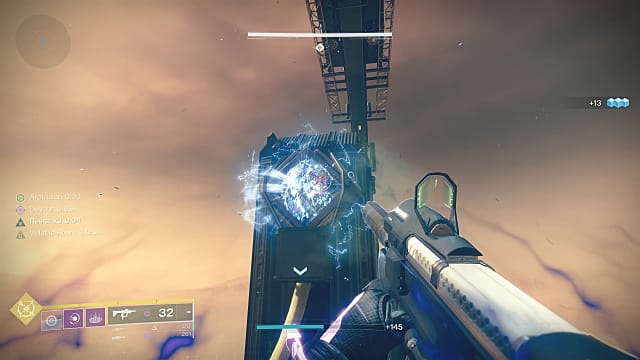 As you leave the grav-lift, a group of Vex Goblins will spawn. Turn around to face the Spire and then head to your right. You’ll pass another Minotaur and reach the starting nodes guarded by volatile streams of Arc energy. You don’t have to interact with these hazards. Simply shoot the starting nodes. For our purposes, the one closest to you here will be “right.” The farther one will be “left.”