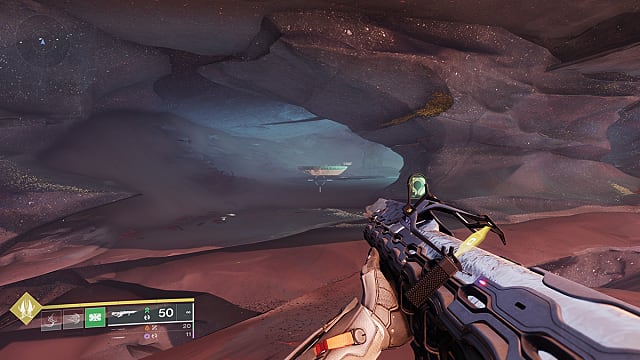 Jump onto the ruined guns and walk to the very end of each, but don’t fall off. Standing at their end will cause a small black crystal to appear in the distance, directly to the front of the ruined guns.