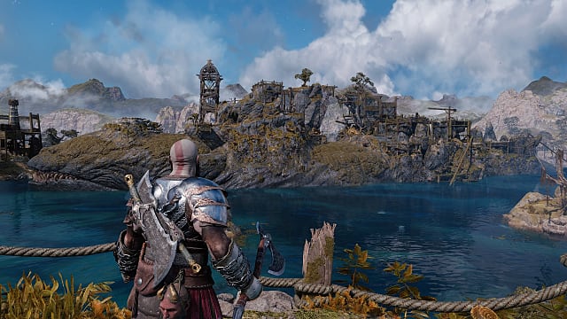 Once on the island, use the Leviathan Axe to blow up the barrier to the right of the dock, and defeat the Wretches that spawn. Go up the path. Destroy the Wretch Nest at the top, and then climb up the small wall.