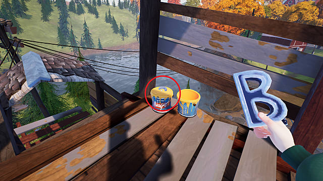 Letter C can be found high up on the roof of the house. From the last letter, climb the boards until you reach a window on the right side. Go through the window, and follow the boards up to the peak of the roof, then higher up the tower. You’ll reach a platform with two yellow paint cans on the right side. The Letter C is on one of the paint cans. Be sure to drop down just beyond the Letter to find the shovel for later in the area if you don’t have a shovel already.