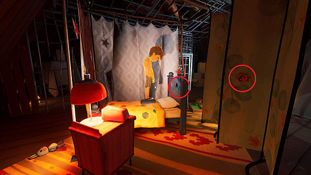- Block 2 (blue) can be found on the headboard of the bed. Block 3 (orange) can be found on the inside of the curtain by the bed.
