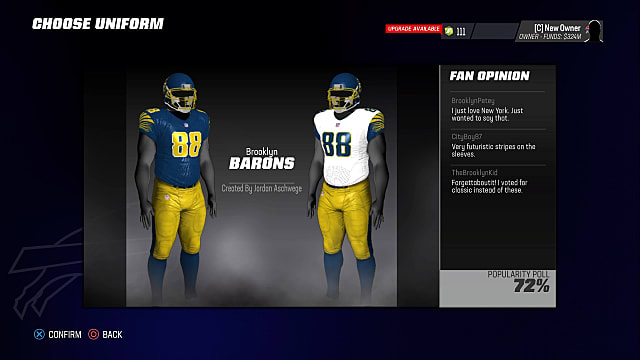 Week 7 of the regular season is when you will be able to choose your new uniforms. As with team names, each prospective uniform has a popularity score, which can be found in the bottom right of the uniform card. More popular uniforms have a great positive impact on fanbase happiness.