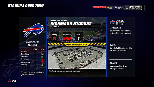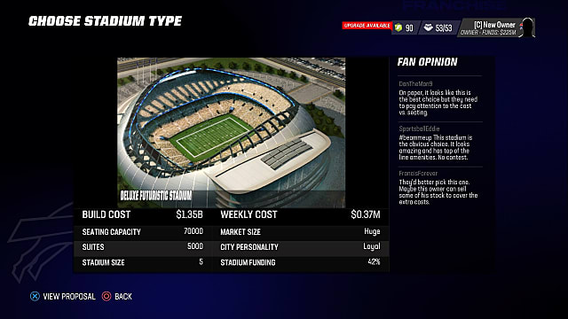 Review the stadiums below, then choose “View Proposal” and “Begin Construction.” It will take the rest of the season to build the new arena.