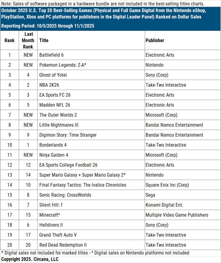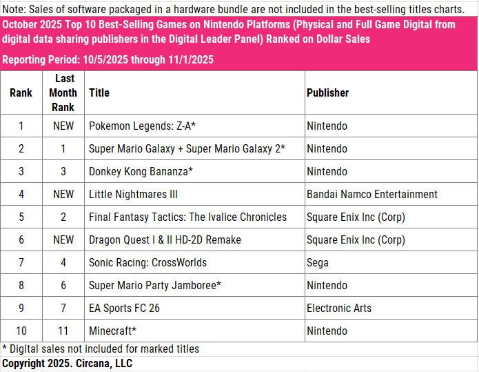 Mat Piscatella: “Pokémon Legends: Z-A ranked 2nd overall during October and was the month’s best-selling game on Nintendo platforms. It launched as 2025’s best-selling physical game year-to-date.”