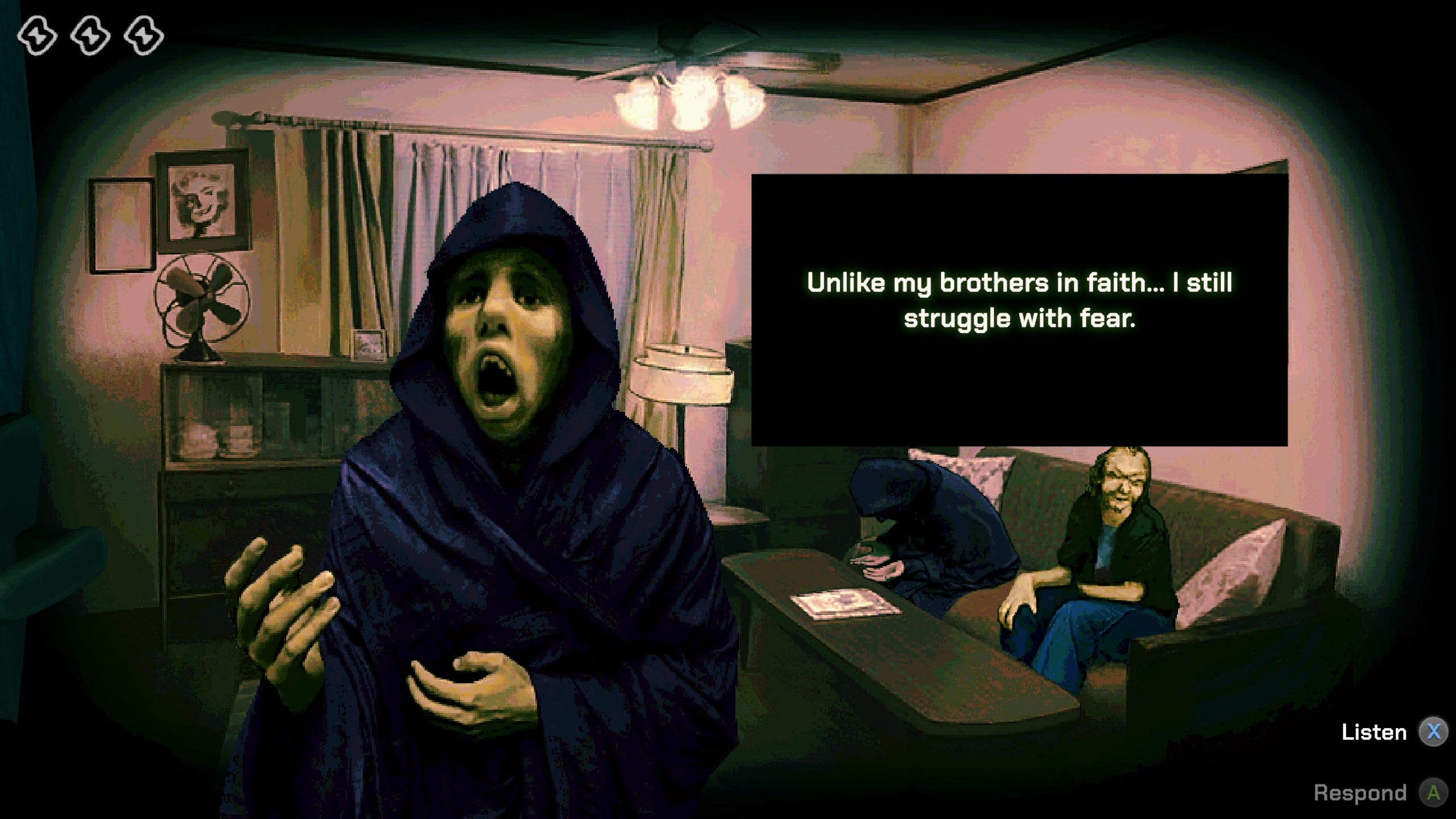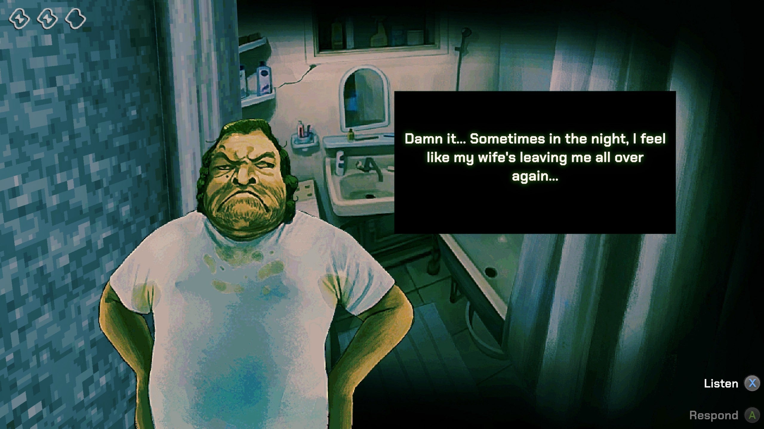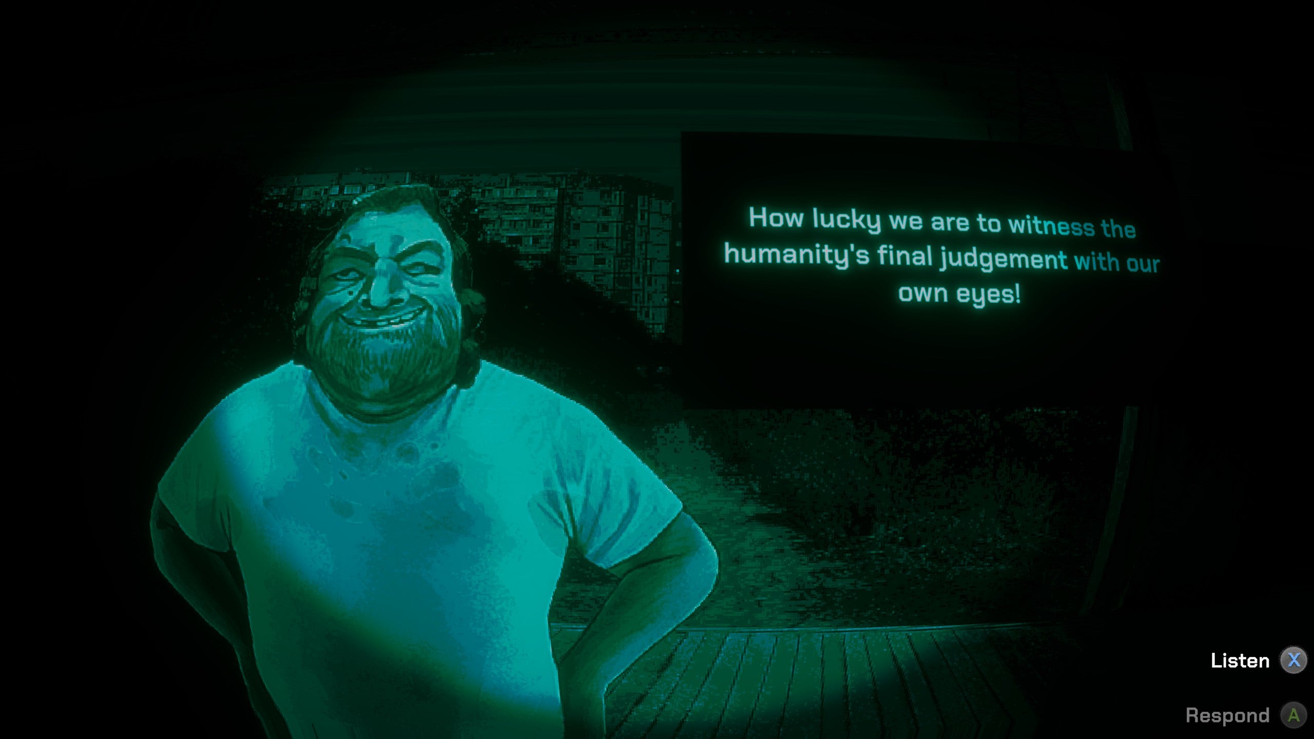With the scene set, things soon settle into a distinct rhythm – a cycle of repetition that’s suffocating in its own way. You sleep by day, as the burning sun turns the world to ash, then wake at dusk, always to another knock-knock-knock at the door. Each night as the world cools, a ghoulish parade of loners and losers – drunks, wasters, conspiracy theorists, religious nuts – appears on your doorstep, each requesting sanctuary. And it’s for you to decide whether to welcome them in or send them on their way. Any of them might be a Visitor – othered creatures with human faces and unclear intentions – but companionship, you’re warned, is critical for your survival. A nightmarish end supposedly awaits if you’re visited by the Pale One when all alone.