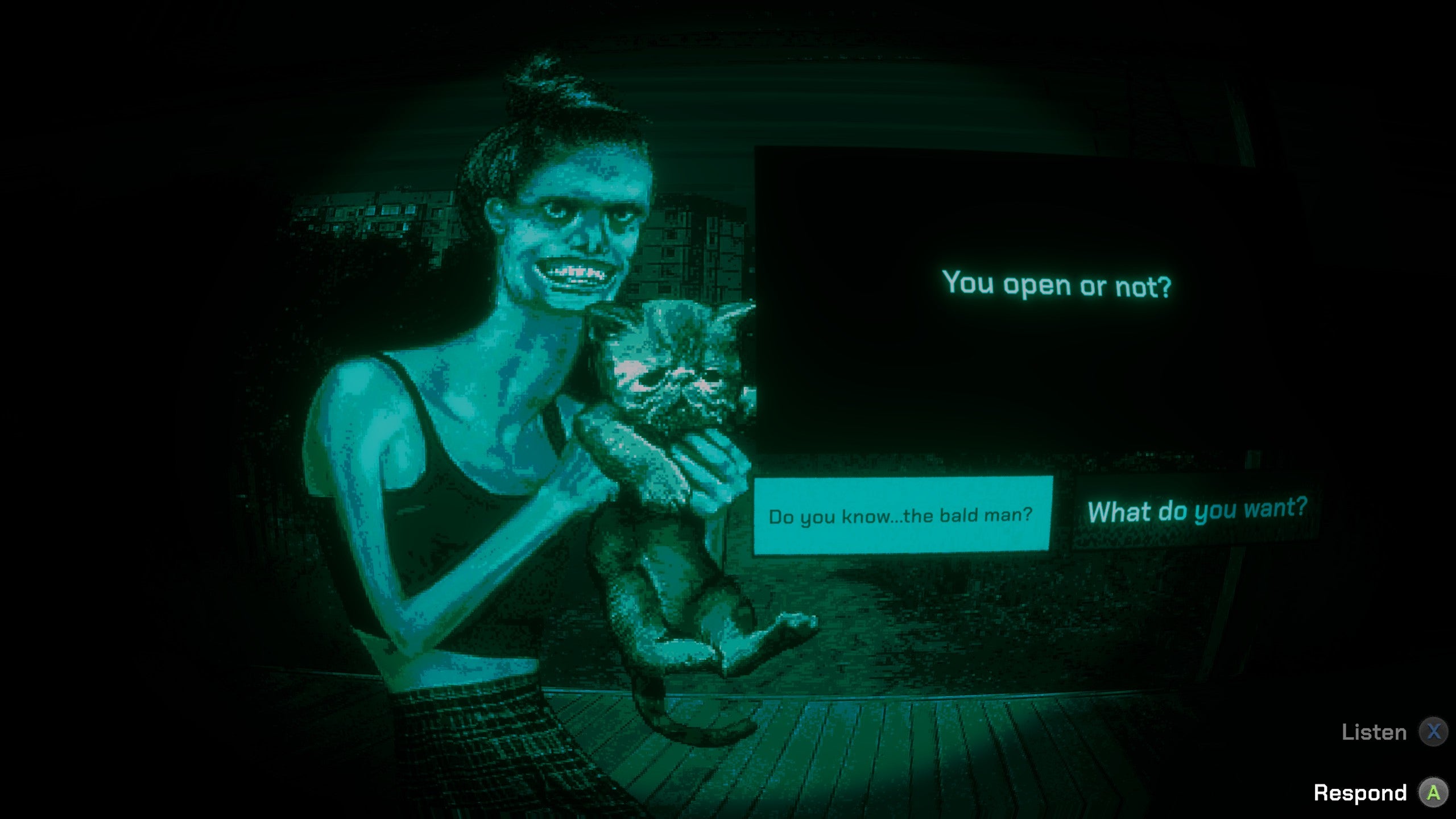 It’s night. You, whoever you are, stand in a sparsely decorated hallway, walls papered in disorientating swirls of lurid green. An upbeat melody plays insistently on the soundtrack, waning and warping in a way that immediately unnerves. Suddenly, a knock at the door; you peer through a peephole and a sullen face stares back – a concerned neighbour with news of a deadly heatwave, dangerous Visitors with human faces infiltrating homes, and a firm warning to stay indoors. (It’s a little weird my two favourite horror games this year, the other being Look Outside, involve people being trapped inside a building as meteorological calamity rages without, but that’s probably a story for another day). Then, bedtime.