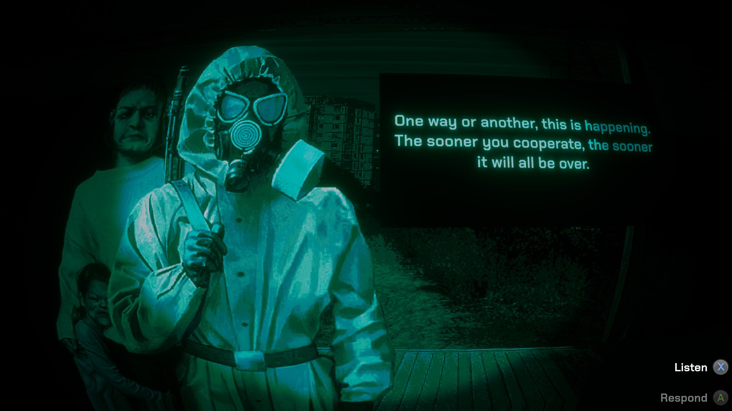 No, I’m not Human might present itself as a sort of quirky deduction horror, but it feels equally haunted by the spirits of This War of Mine, Papers, Please, and Pathologic 2. Gradually, almost imperceptibly, its initial affectations slip away; the mood grows sombre and an overbearing sense of hopelessness settles in. As you spend more time with your oddball guests (assuming they survive each night) they’ll begin to open up, sharing humanising stories of their strange, sad lives. Each glimpse out the window paints an increasingly severe picture of the world beyond. Glib observations make way for genuine pathos as cities burn, ash-faced corpses hang from telephone poles, and children rot in the streets. By the time my playthrough ended with the protagonist pounding another man’s face to a liquefied pulp using his bare hands, it felt like we’d come a long, long way in a few short hours.