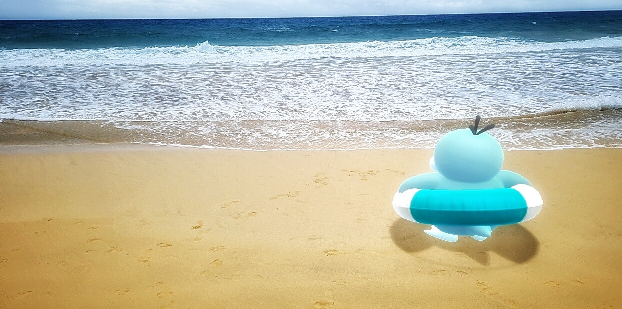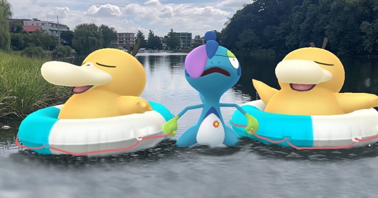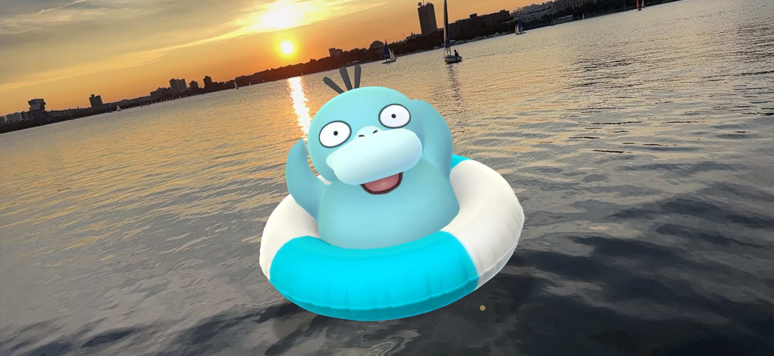 ‘Psyduck’s newest costume is one of my favorites in Pokémon GO. The light blue color of the inner tube matches the color of Shiny Psyduck perfectly! It was a lot of fun walking around Boston looking for a fun place to take an AR picture. Sunset on the Charles River was absolutely gorgeous!’