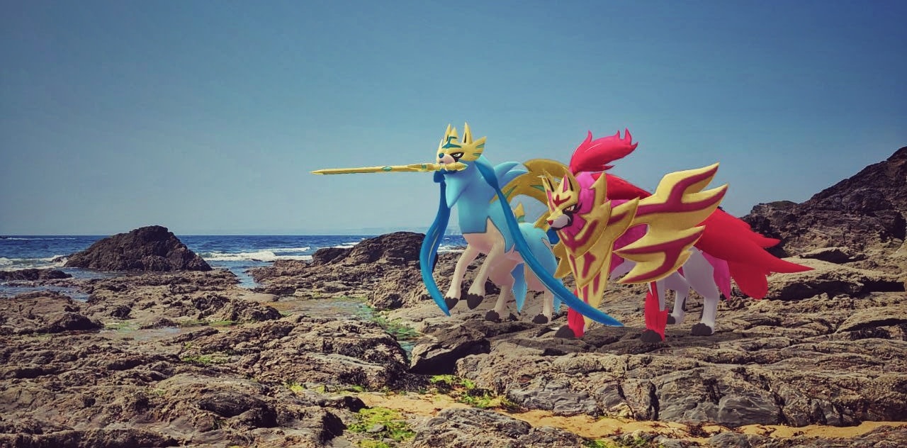 ‘Upon the ancient shores where land meets the endless sea, the legendary heroes Zacian and Zamazenta emerge, their radiant blades gleaming under the sun. Said to be protectors of balance and guardians of honor, they stand vigilant against unseen threats, their presence a reminder that even in times of peace, the world is safeguarded by timeless courage and unwavering loyalty.’