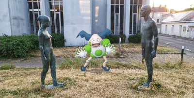 ‘Mr. Mime strikes a pose amidst two other statues, his vibrant green accents adding a playful twist to his traditional mime appearance.’