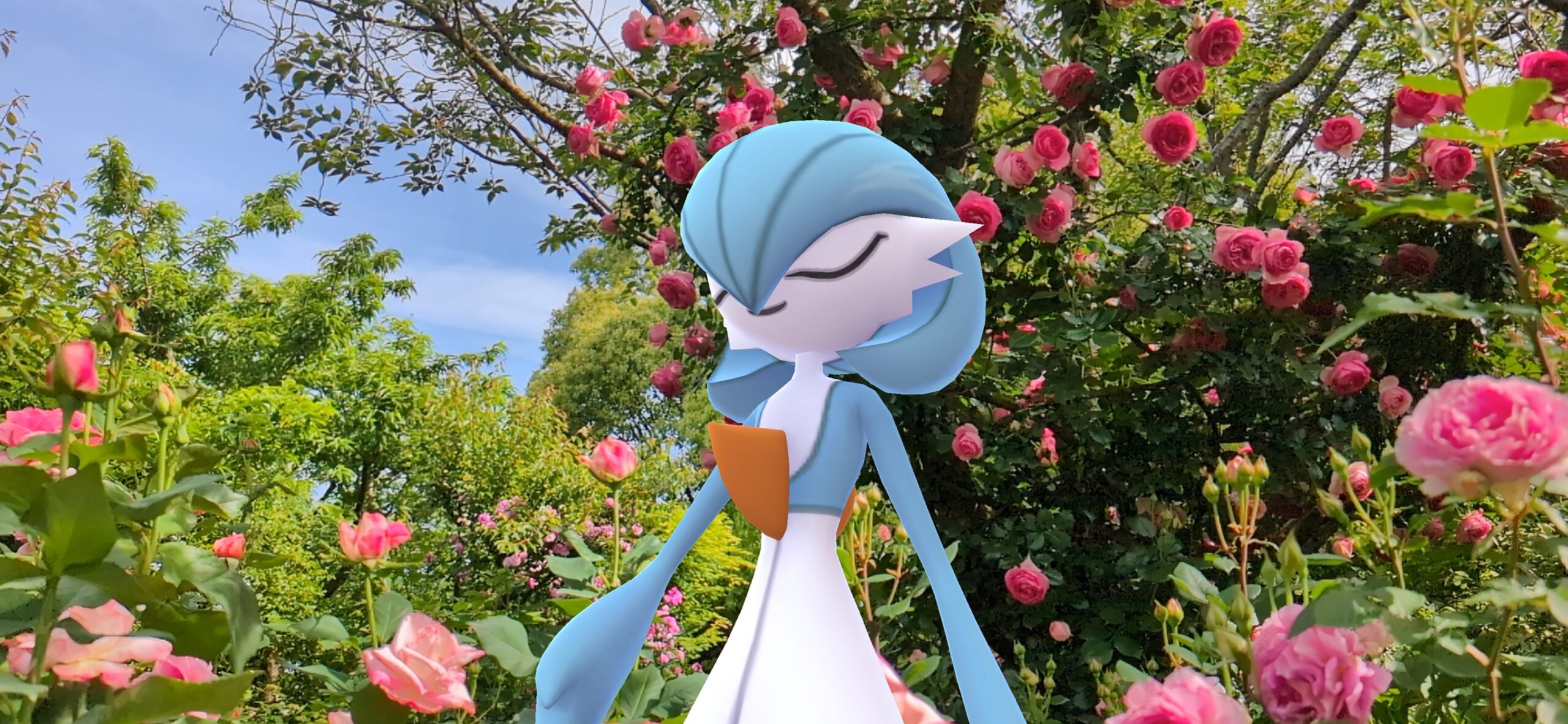 ‘On a sunny day, Gardevoir gracefully strolls through a garden in full bloom, surrounded by roses.’