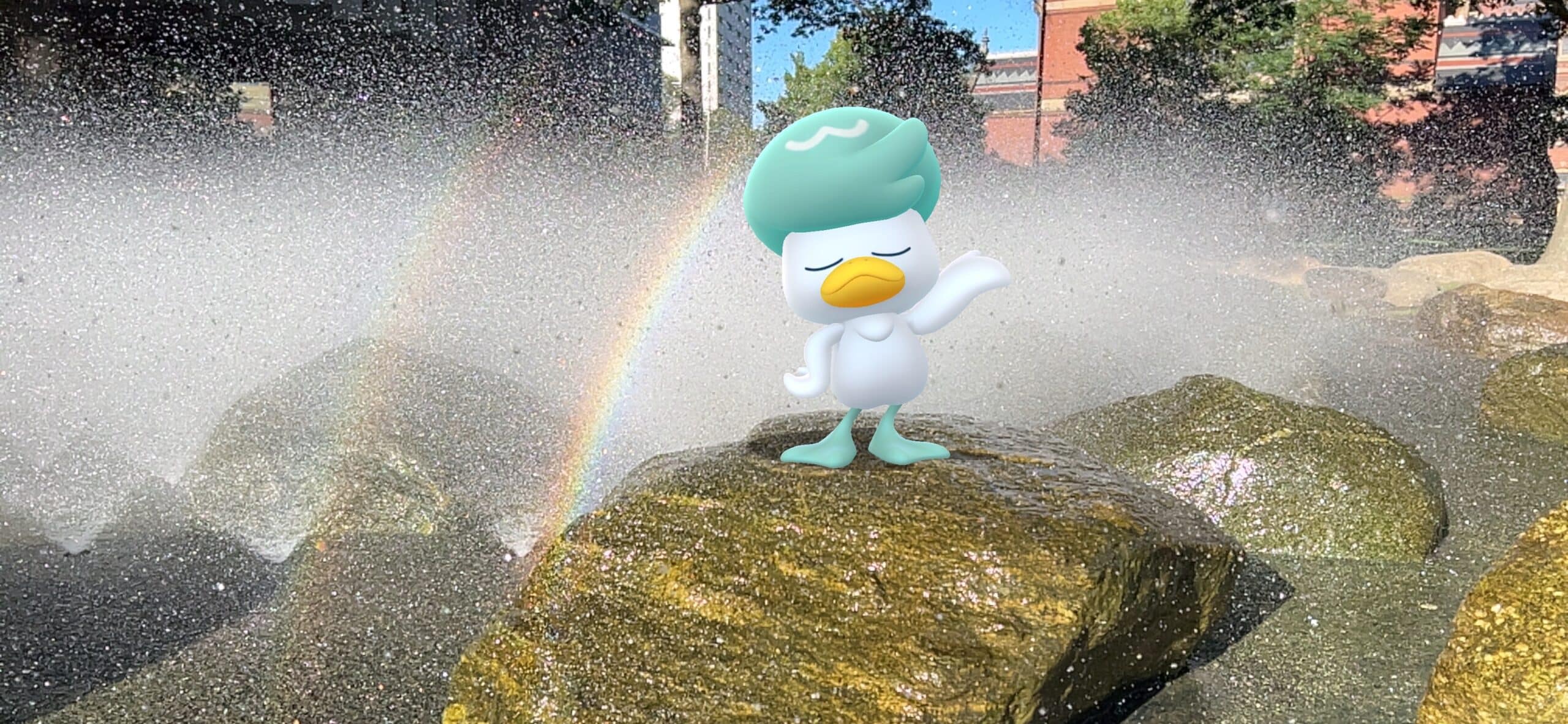 ‘As a Community Ambassador, I always try to take fun AR photos for my Campfire meetups. Ahead of Quaxly Community Day, I found a beautiful set of fountains that created a rainbow close to sundown. I initially took a photo of a non-Shiny Quaxly, as the Shiny had not yet been released, but later came back to retake the photo with a Shiny! I also slightly changed the angle and positioning to better highlight Quaxly’s posing. This is one of my favorite AR photos I’ve taken in recent memory!’
