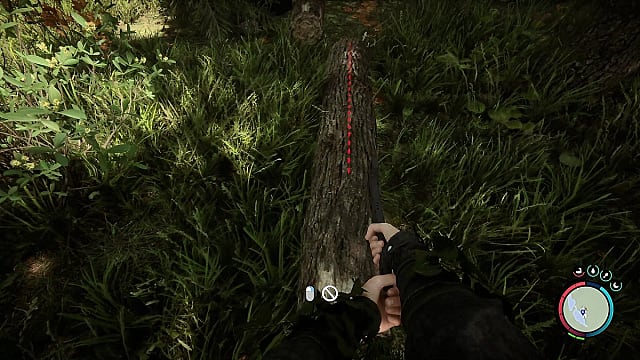 The first thing you’ll want to do is gather logs by cutting down trees. With a log in hand, hold the primary action button (LMB/RT by default) to put the log down where the dotted lines are shown.