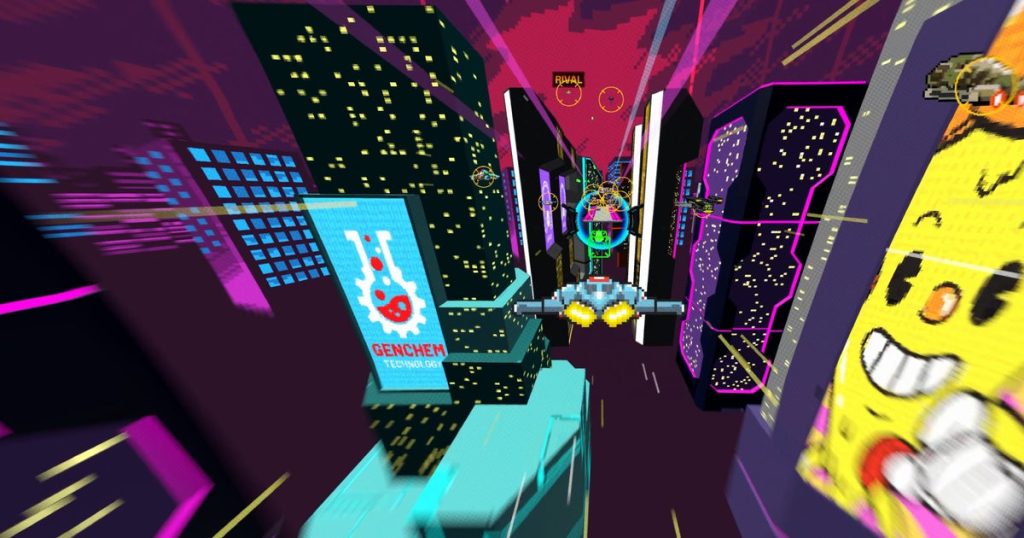 While it’s easy to run out of energy and crash out if you boost too hard or forget to strafe-drift through the long, sweeping bends that a lot of the courses boast, there’s a wonderful zippiness to the flight. Some sections see your ship stick close to the ground and others ping it up into the air so you can properly fly for a bit.