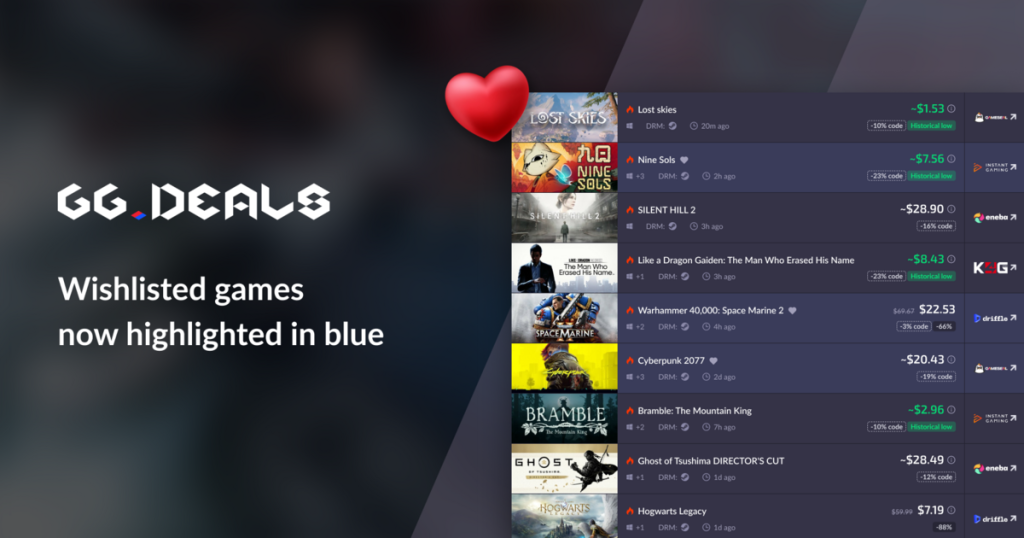 We’ve just rolled out a small but highly requested usability improvement on GG.deals. From now on, games that you’ve either wishlisted or added alerts for are highlighted with a subtle blue glow across the site. This makes it much easier to scan any list and instantly spot the titles you’re already tracking.